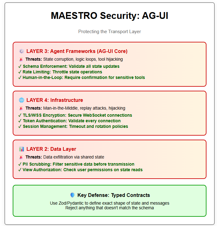 The MAESTRO framework provides a structured approach to identifying and mitigating threats across the entire AI agent stack. Each layer represents a different attack surface, and both AG-UI and A2UI intersect with multiple layers in unique ways.