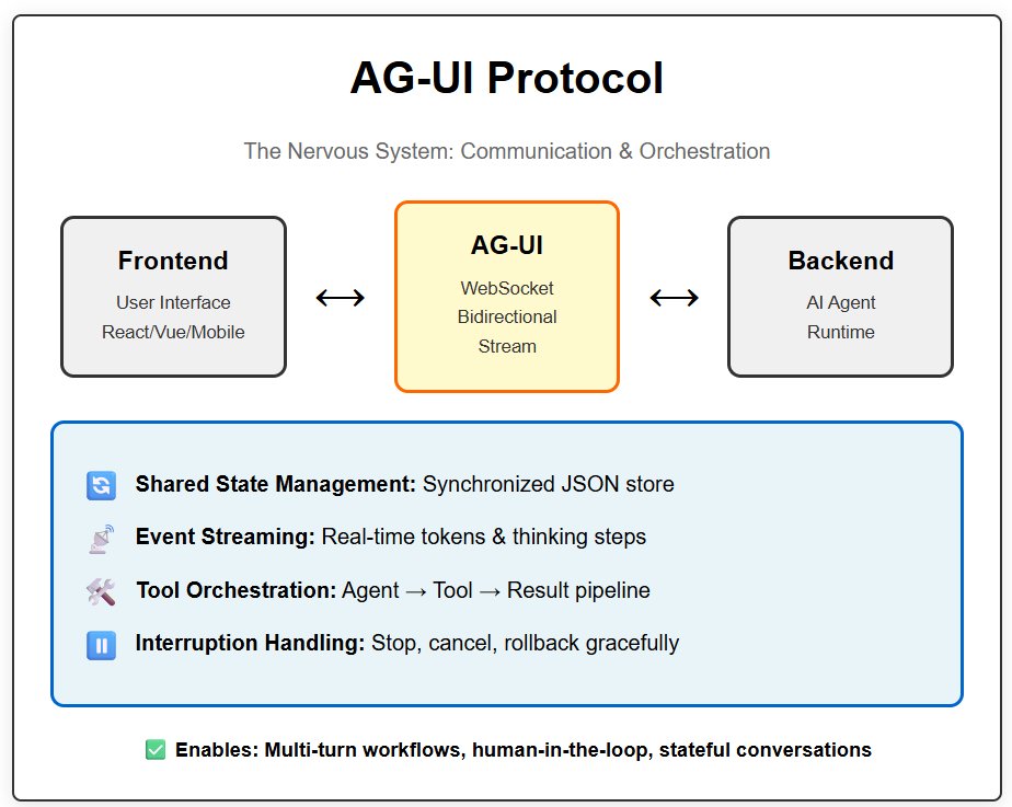 AG-UI provides the reliable, stateful connection required for complex orchestration.