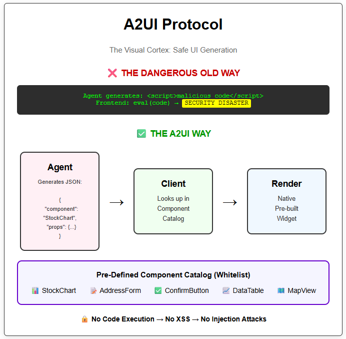 A2UI relies on a Component Catalog. The developer pre-defines a set of safe UI components (e.g., <StockChart />, <ConfirmButton />, <AddressForm />) on the client.