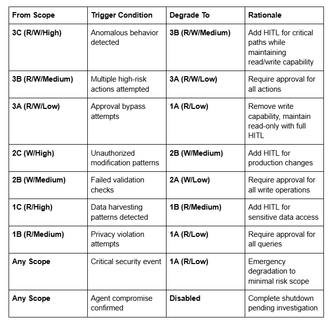 Why Not Scope 2A (Write/Low)? Although Scope 2A requires human approval (seemingly more restrictive), a write-capable agent poses fundamentally different risks. Even with HITL, a compromised write agent could execute approved-but-malicious modifications. The fraud detection agent’s read-only nature makes it inherently lower risk despite high autonomy.