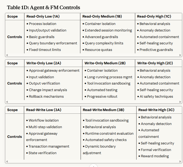 Each scope comes with tailored security controls across six critical dimensions: Identity Context, Data Protection, Audit & Logging, Agent & FM Controls, Agency Perimeters, and Orchestration. This progressive framework enables organizations to assess their agentic AI use cases, identify security gaps, and implement appropriate controls for their level of autonomy.