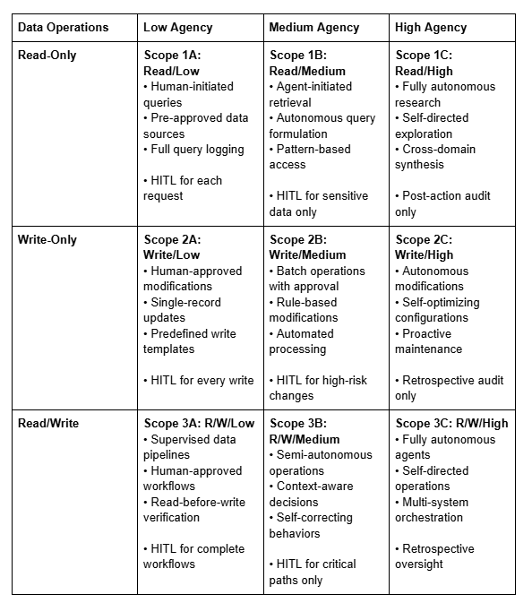 The current framework’s single-axis progression from Scope 1 to Scope 4 conflates two distinct dimensions: data operation capabilities (read vs. write) and autonomy levels (human oversight vs. autonomous operation). This creates ambiguity in risk assessment: