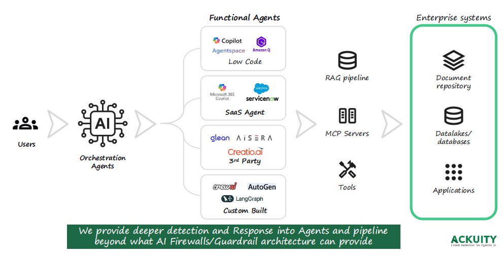 Ackuity’s architecture secures the full depth of the Agentic Pipeline, recognizing that modern AI risks extend far beyond the user prompt. As illustrated, the platform monitors the entire workflow: originating at the Orchestration Layer where decisions are delegated, flowing through diverse Functional Agents—including Low Code, SaaS, and custom-built LangGraph swarms—and extending into the critical infrastructure of RAG pipelines and MCP Servers. By instrumenting this entire chain all the way to the Enterprise Systems (databases and document repositories), Ackuity provides deep visibility into the intermediate steps of agent execution, detecting threats that traditional, perimeter-based AI firewalls inevitably miss.