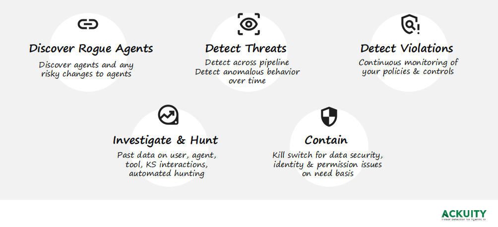 Securing the Agentic Pipeline requires a move toward deep observability. Platforms like Ackuity demonstrate that effective security requires a holistic approach—Discovering the asset surface, Detecting both threats and policy violations, Investigating with deep context, and possessing the capability to Contain threats at the infrastructure level.